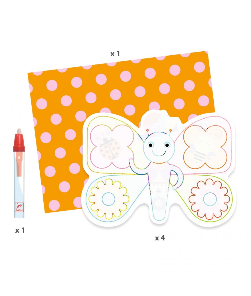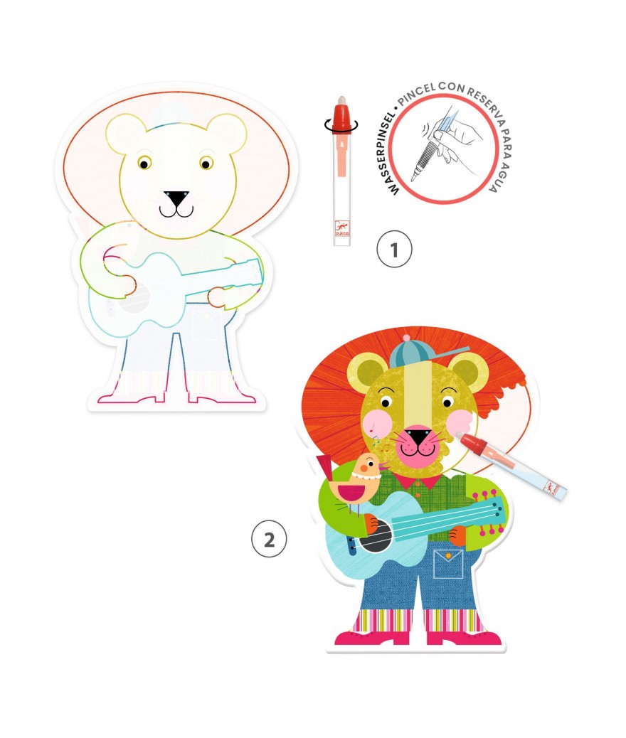 Kleuren met water, geschikt voor kinderen vanaf 18 maanden. Het kind kleurt de dieren in met de waterpen en ontdekt wat er verborgen zit achter de witte zones. Magisch: er verschijnen patronen die van kleur veranderen! Wanneer de kleurplankjes droog zijn, kan het kind opnieuw beginnen!