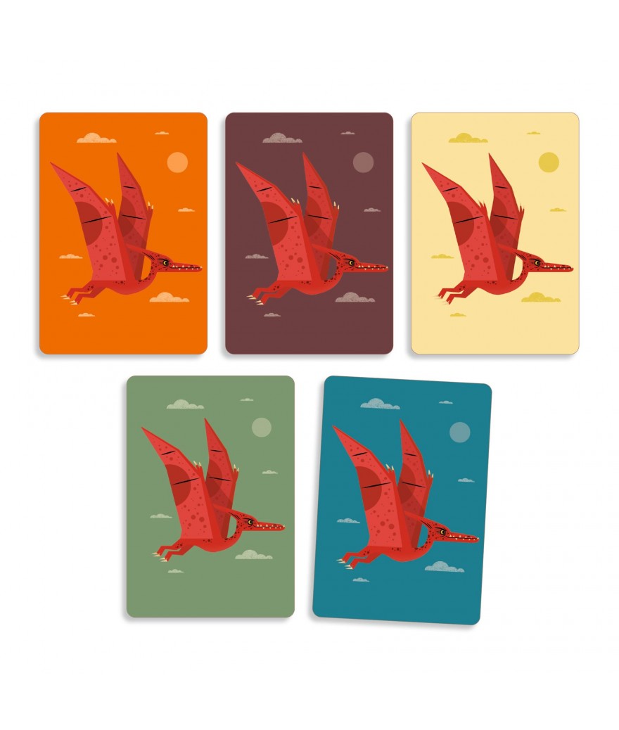 Stegosaurus, triceratops, brachiosaurs en pterodactyls zijn uit. In dit spel worden de kaarten van hand tot hand doorgegeven en kan er slechts één kaart per ronde worden bewaard.
