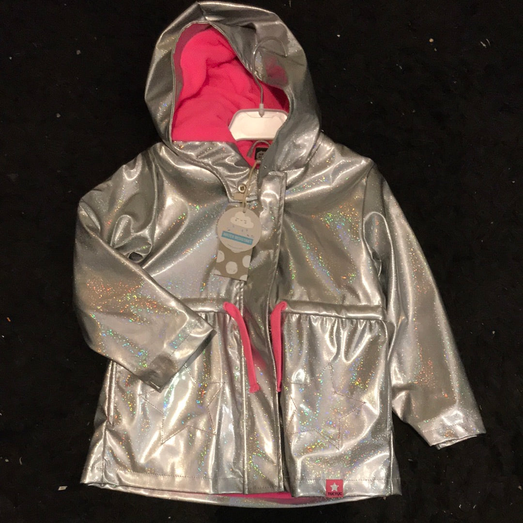 Glitterregenjas holografisch zilver gevoerd met roze polarfleece en grappige print op t achterpand. Ritssluiting met windvanger en pullstring in de taille. Opgestikte sterren op t voorpand en 2 zakken in de zijnaad. Maat 92 cm