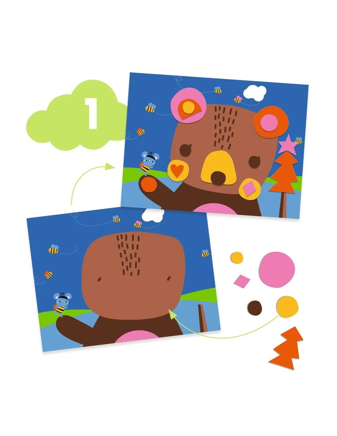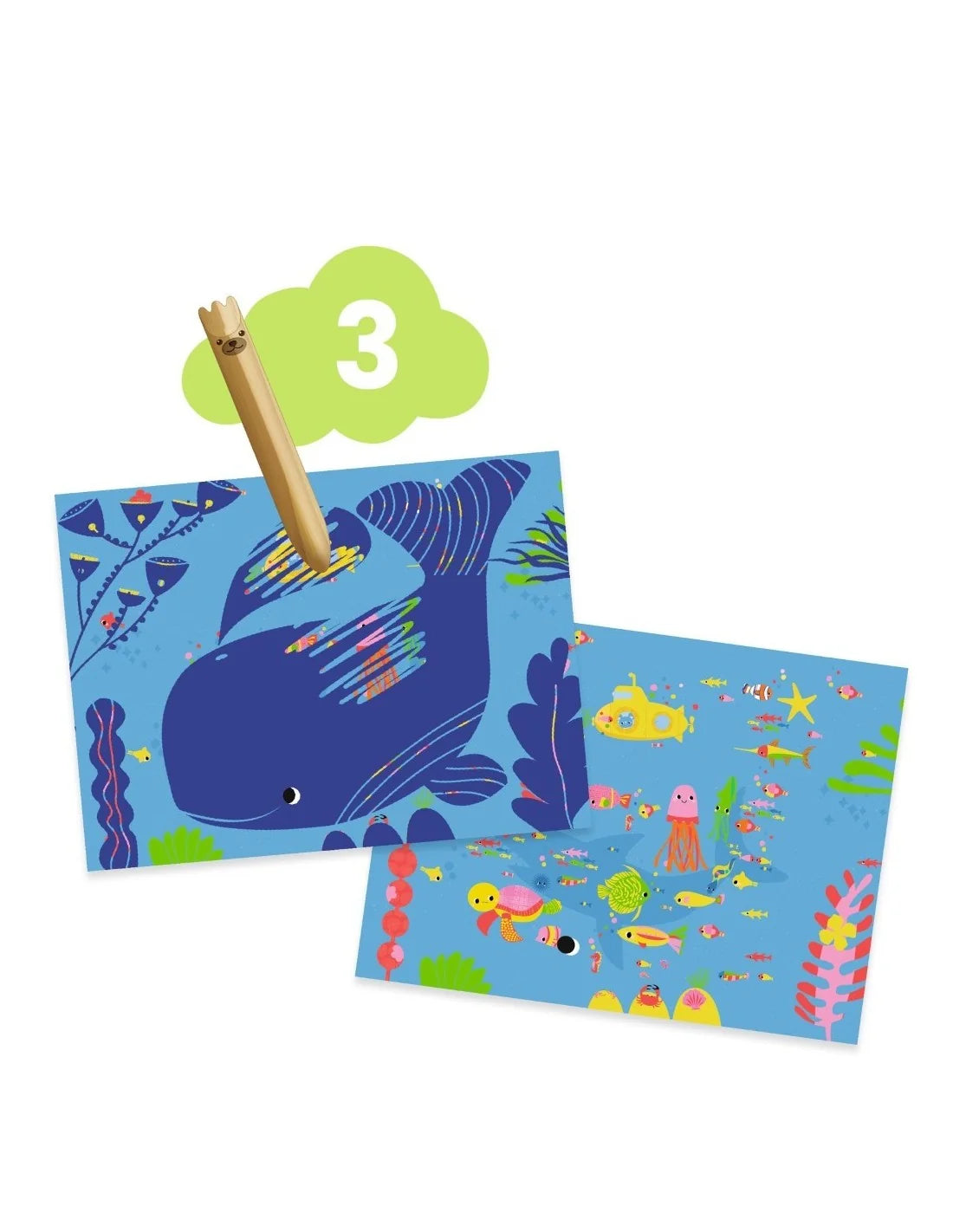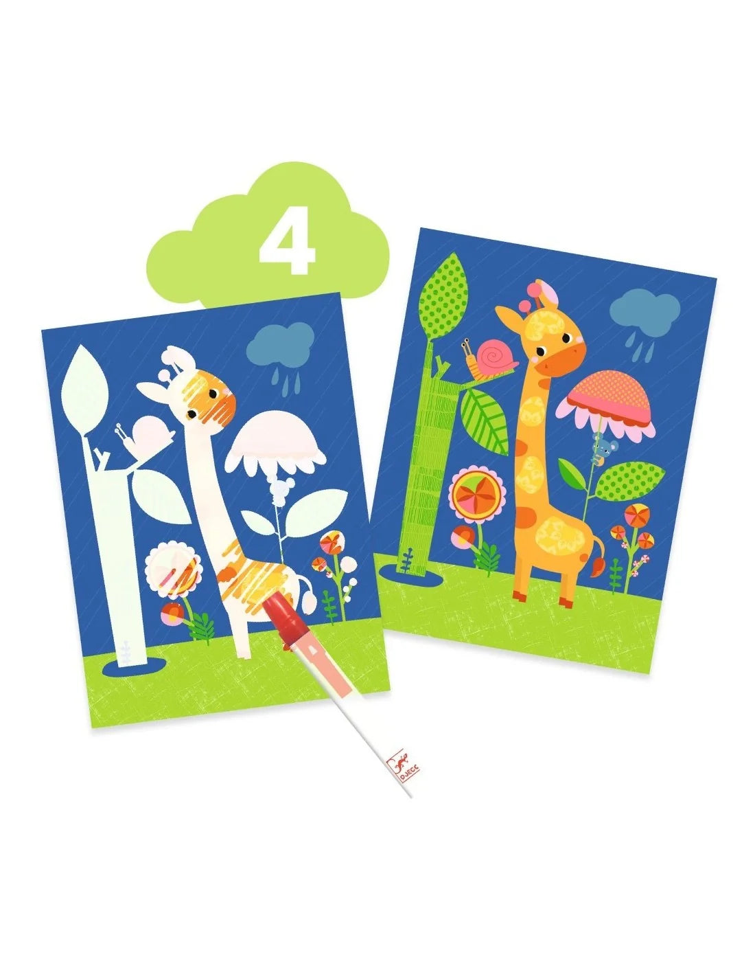 Inhoud: Plakken: 1 geïllustreerde kaart, 1 voorgesneden vel van dik karton, 1 tube lijm. Plakken met vilt: 2 vellen om te versieren, 4 vellen met zelfklevende stukjes vilt. Color stop: 4 geïllustreerde vellen, 1 sjabloon, 4 kleurpotloden. Kleuren met water: 1 kaart met een witte laag, 1 waterpen. Kleurplaten die tevoorschijn komen: 3 kleurkaarten met magische lak. Kraskaart: 3 kaarten en 1 houten hulpstuk. 1 boekje met stap-voor-stap uitleg.