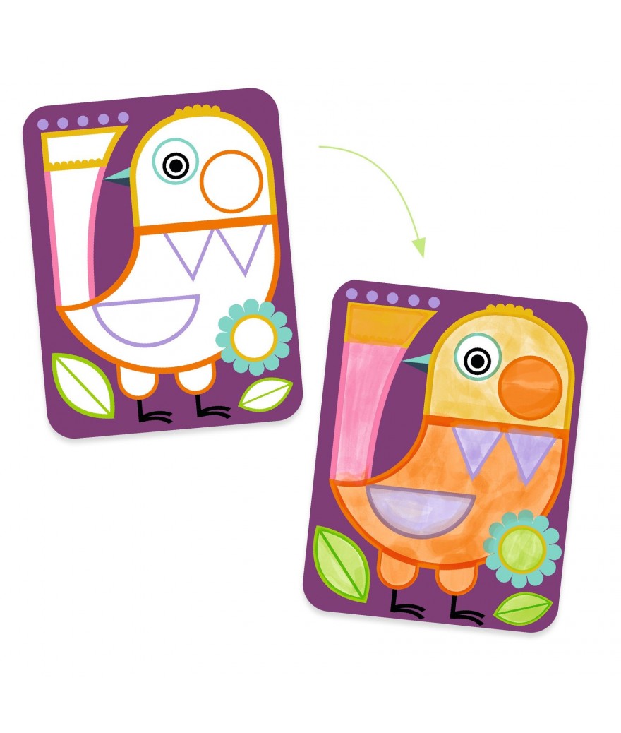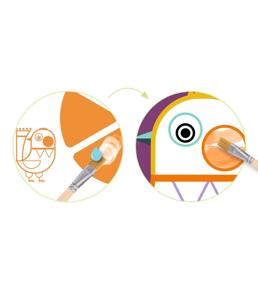 4 platen om te beschilderen, 4 bedrukte inktpaletten, 1 kwast met houten steel en een instructieboekje met plaatjes (zonder tekst).