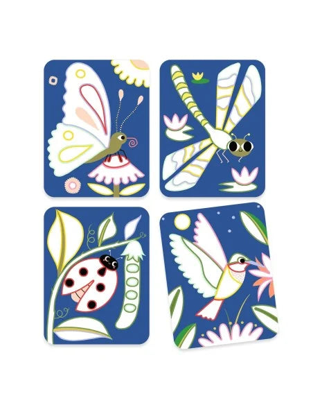 4 platen om te beschilderen, 4 bedrukte inktpaletten, 1 kwast met houten steel en een instructieboekje met plaatjes (zonder tekst).