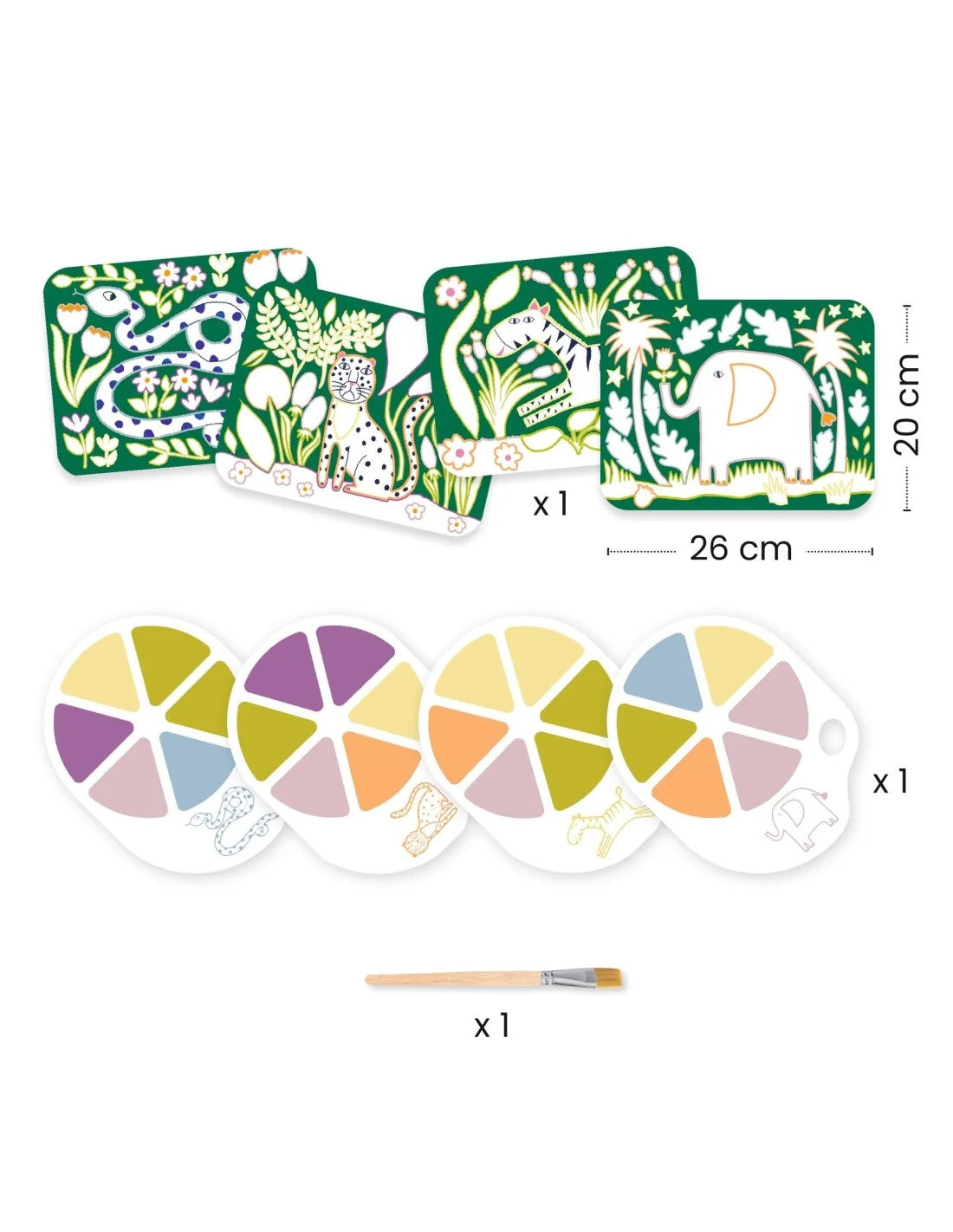 4 platen om te beschilderen, 4 bedrukte inktpaletten, 1 kwast met houten steel en een instructieboekje met plaatjes (zonder tekst).