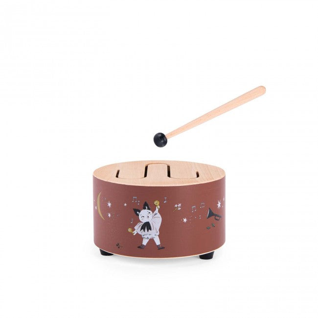 Tambour en bois, tout en rondeur et facile à manipuler. Il éveillera la sensibilité musicale et le sens du rythme de votre enfant. Les sons variés qu'il produit dépendent de la zone où il est tapé, que ce soit avec la baguette ou les mains !