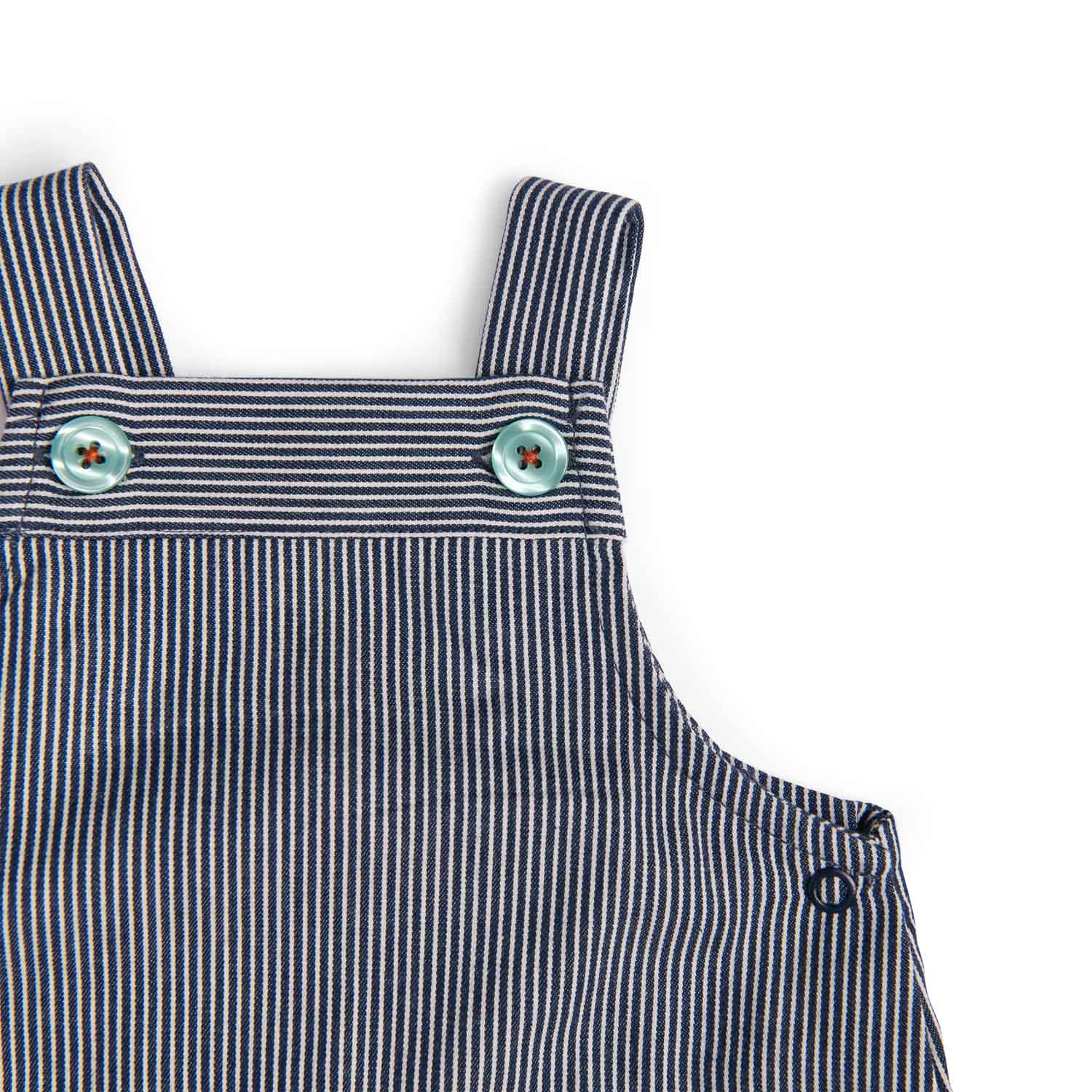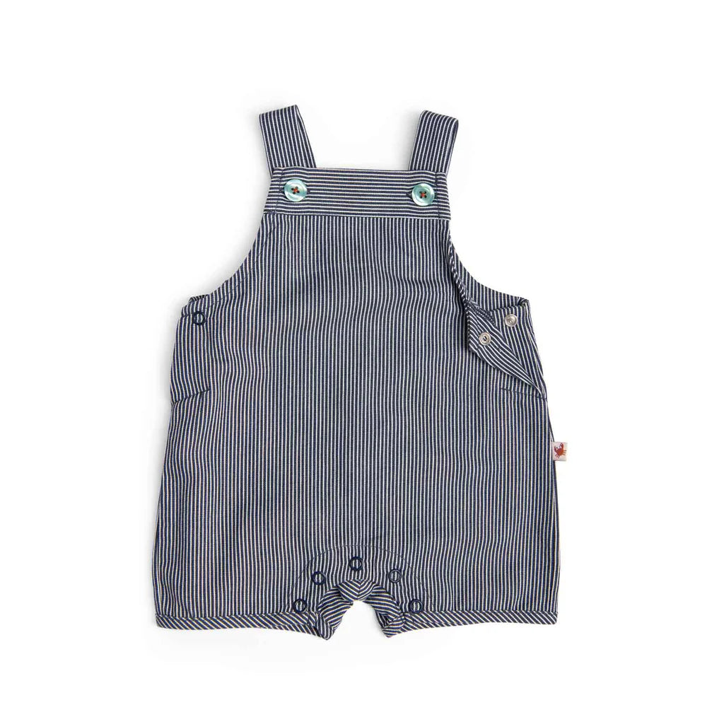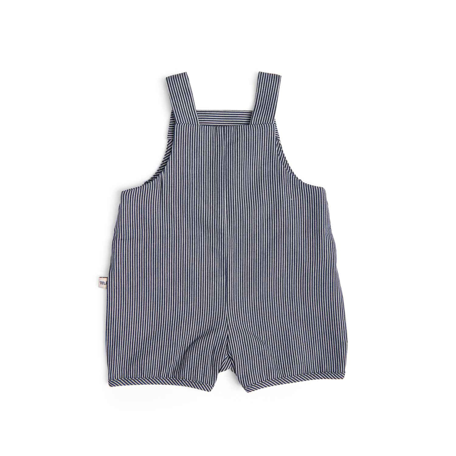 HIPPOLYTE Korte marineblauw-wit gestreepte katoenen tuinbroek met verstelbare bandjes. Drukknopen tussen de benen en rond de armen, makkelijk aan te trekken.