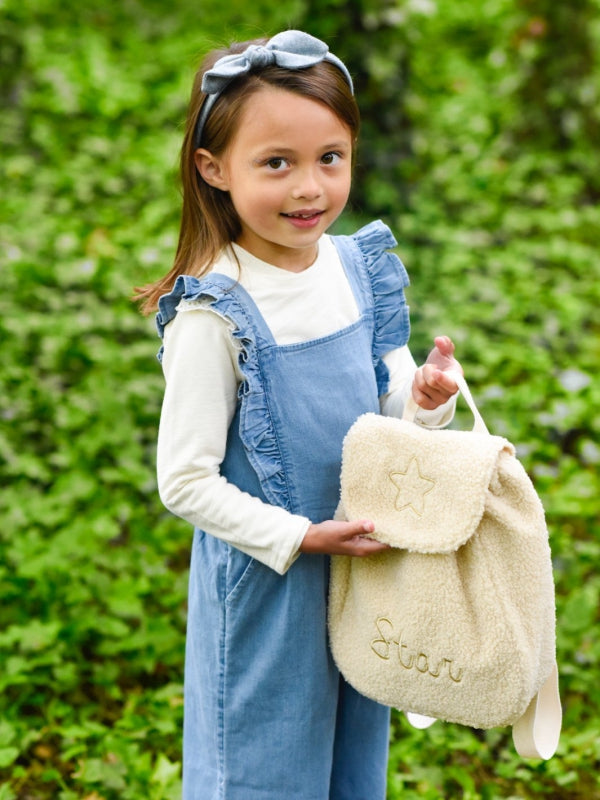Met deze rugzak wordt uw kind de ster van de crèche of school! Het ecru imitatiebont is versierd met gouden borduursels. De klep sluit met een magnetische drukknoop. De binnenkant is gevoerd met katoen en sluit aan de bovenkant met een elastische band voor gebruiksgemak. Op de rug zijn de ecru bandjes verstelbaar.